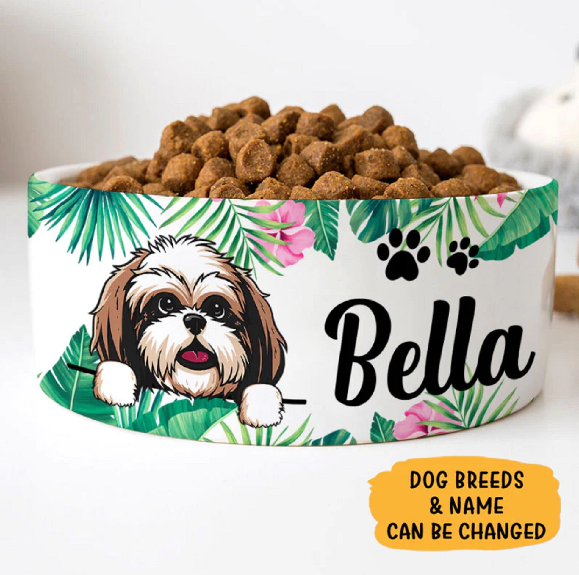 Custom Dog Bowls with Tropical Tree, Personalized Dog Bowl, New Dog Gift, Dog Food Bowl, Dog Water Bowl, Pet Bowl, Dog Lovers Gifts