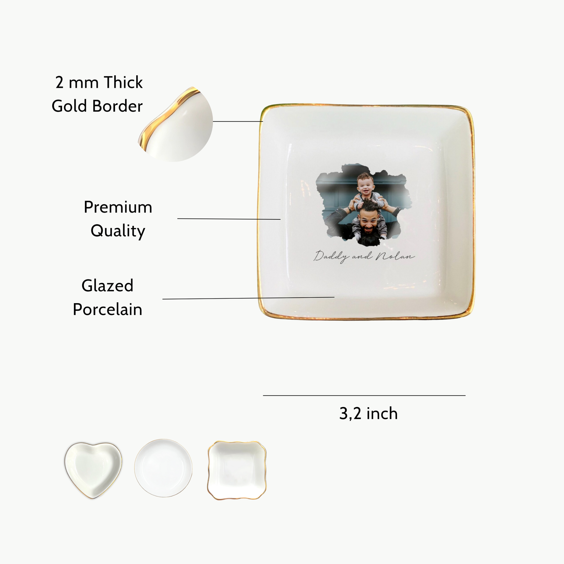 Product Information: A versatile and personalized jewelry tray designed to keep your cherished items organized and stylish. Measuring 0.7 x 3.5 x 3.5 inches and weighing 130 grams, this square ceramic dish features a refined golden rim.