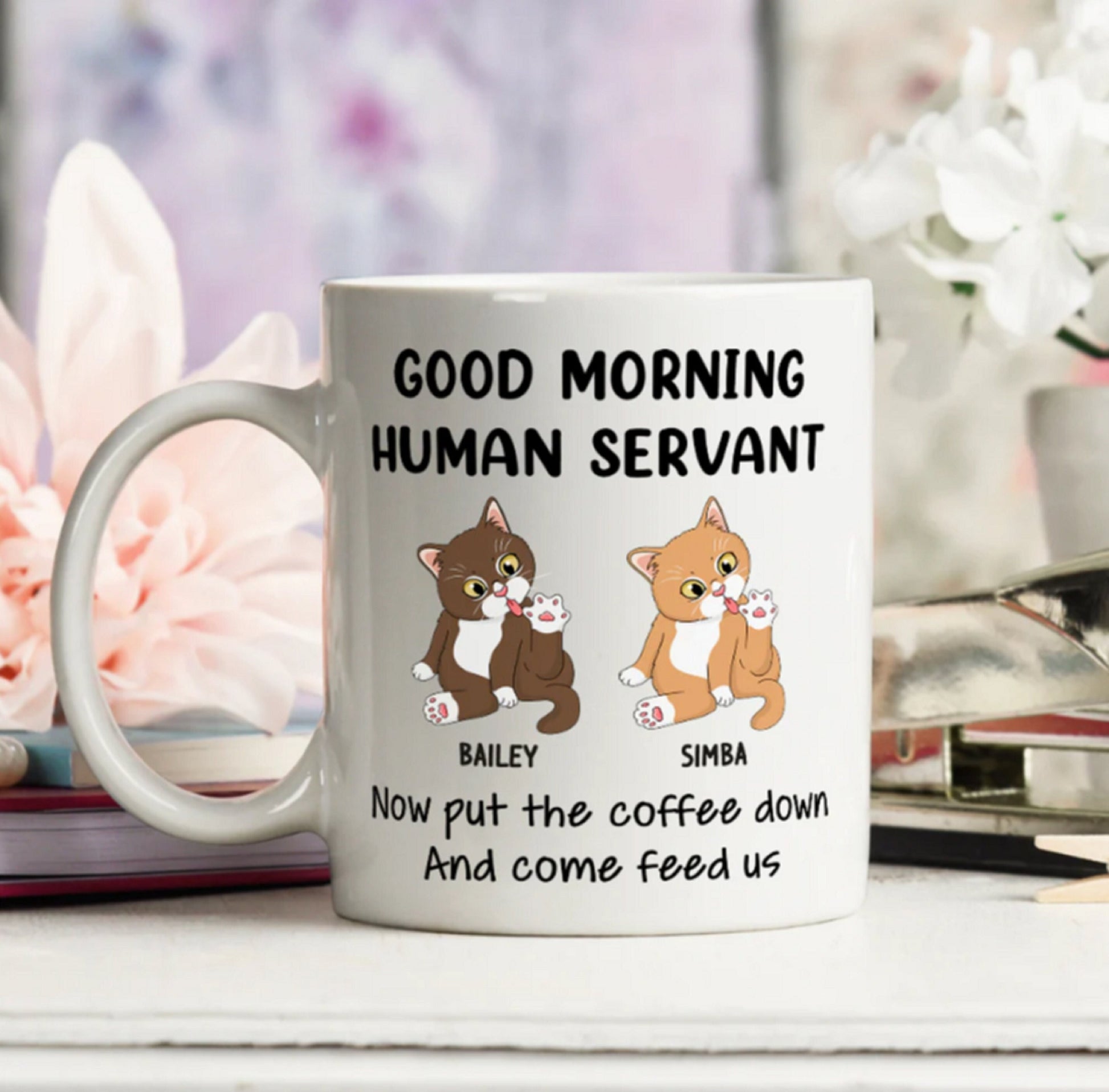 Good Morning Human Servant Cat Personalized Mug, Custom Cat Coffee Mug, Cat Dad, Cat Mom Mug, Gift For Cat Lovers, Vintage Cat Mug